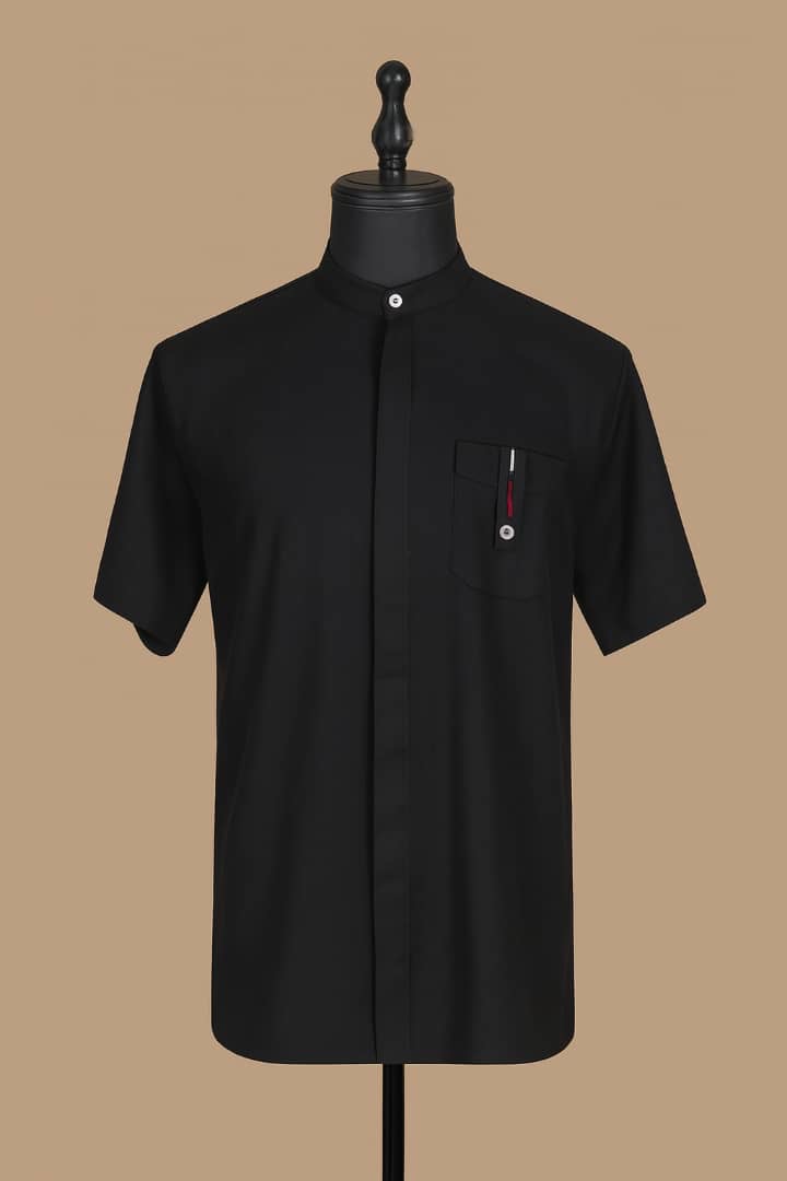 Black short sleeve shirt with some extra designs on the top pocket with covered buttons only the neck buttons is visible