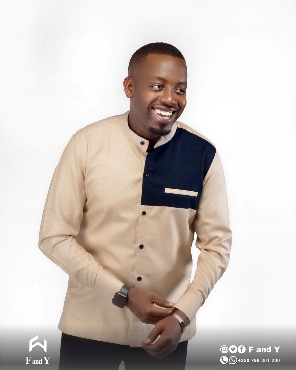 It’s a modern beige short-sleeve shirt with a clean mandarin collar and a bold blue chest panel featuring a matching pocket detail.
