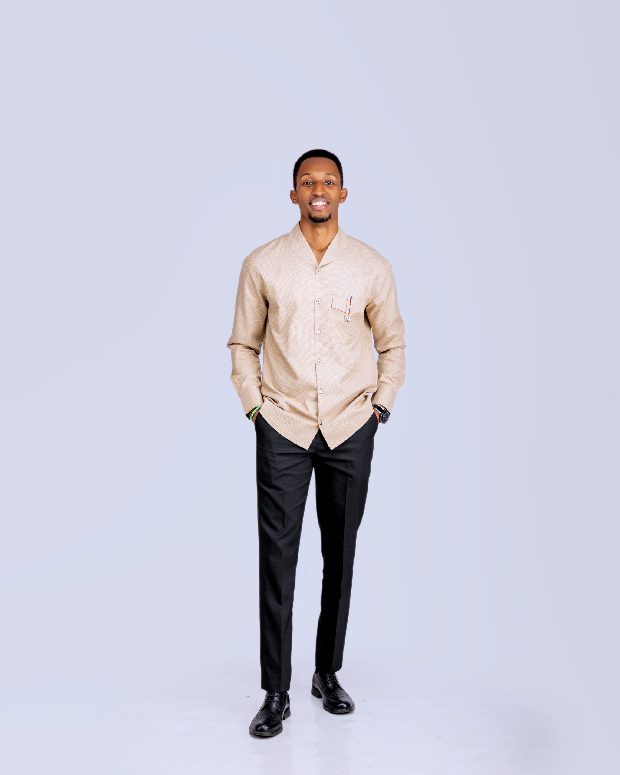 A light-beige long-sleeve shirt with a smooth, tailored finish. It features a unique collar shape, a neat button-down front, and a simple chest pocket with a small accent detail for contrast. The shirt has a refined, structured appearance, giving it a sharp but understated style.