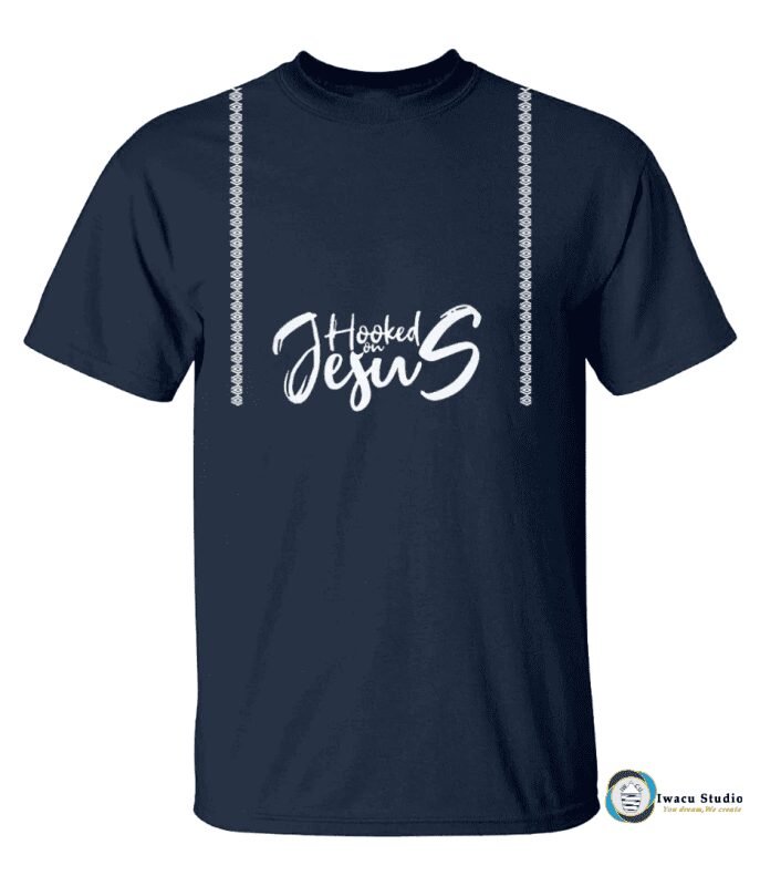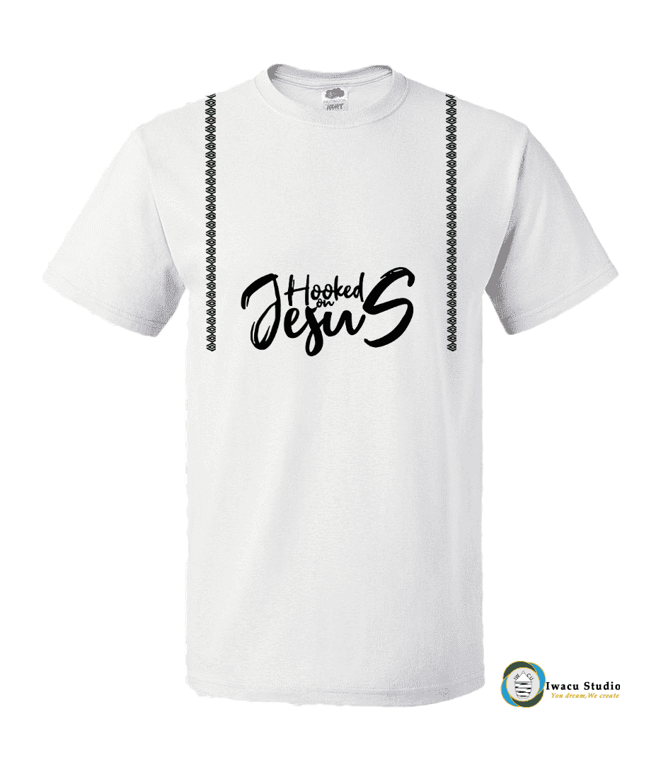 “HOOKED ON JESUS” and accompanied by umugongo pattern going down both shoulders