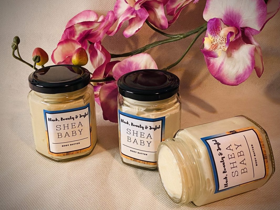 Our 4 oz jar of Shea Baby (whipped shea butter) is smooth and creamy with a drop of honey. It has a natural nut fragrance, but light and perfect for anyone of all ages.