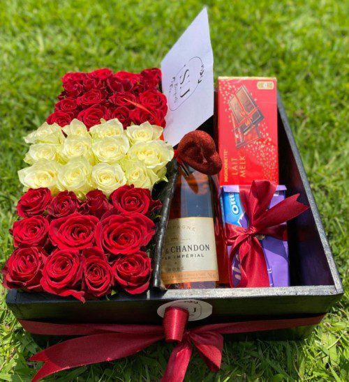 Valentine Gift (35 White and Red Roses, Champagne, Chocolate)