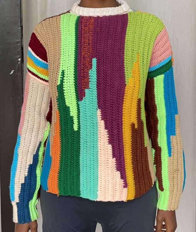 This is a handmade crochet sweater that is designed to be oversized, slightly cropped, or as a long cardigan.