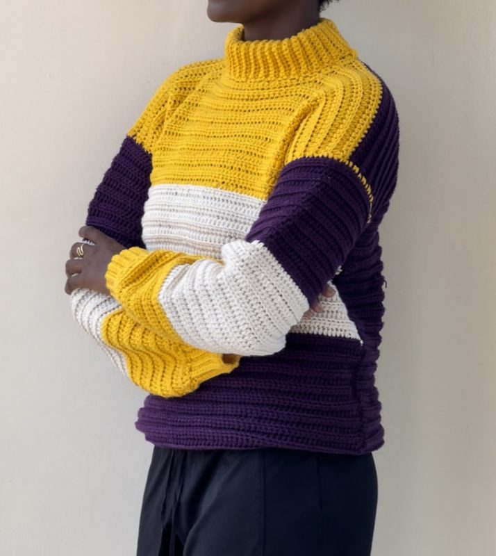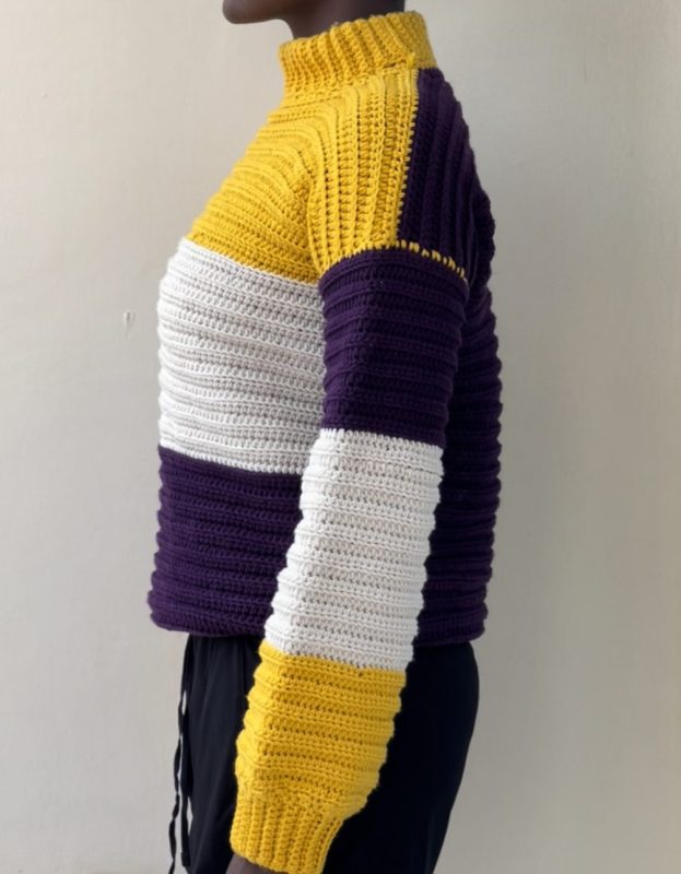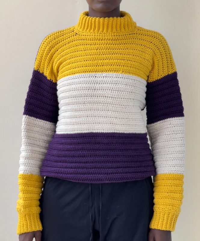 This is a handmade crochet sweater that is designed to be oversized, slightly cropped, or as a long cardigan.