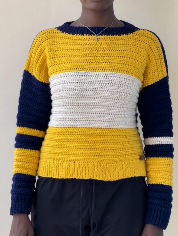 This is a handmade crochet sweater that is designed to be oversized, slightly cropped, or as a long cardigan.