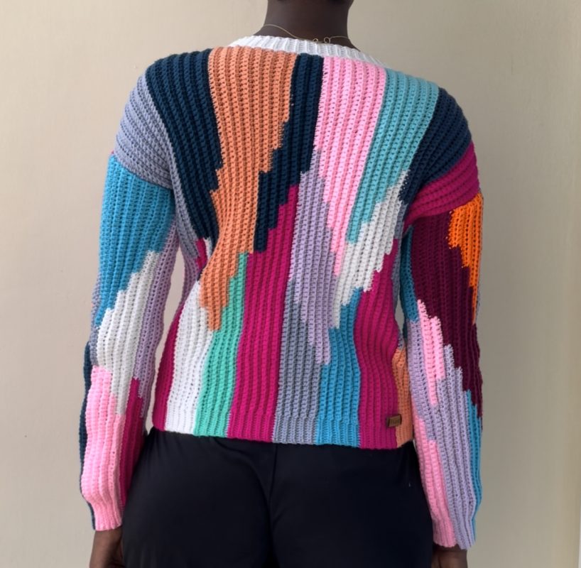 This is a handmade crochet sweater that is designed to be oversized, slightly cropped, or as a long cardigan.