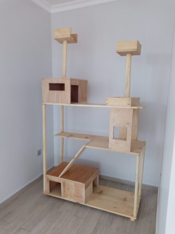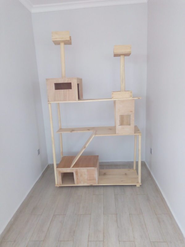 wooden cat house with scratching post